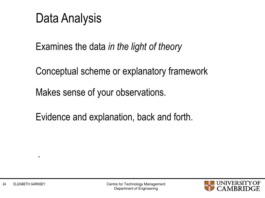 Data Analysis Examines the data in the light of theory Conceptual scheme or explanatory framework Makes sense of your observations. Evidence and explanation, back and forth. . Centre for Technology Management Department of Engineering