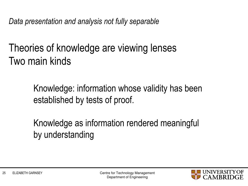 Data presentation and analysis not fully separable Theories of knowledge are viewing lenses Two main kinds Knowledge: information whose validity has been established by tests of proof. Knowledge as information rendered meaningful by understanding Centre for Technology Management Department of Engineering
