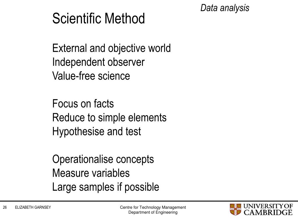 Data analysis Scientific Method External and objective world Independent observer Value-free science Focus on facts Reduce to simple elements Hypothesise and test Operationalise concepts Measure variables Large samples if possible Centre for Technology Management Department of Engineering