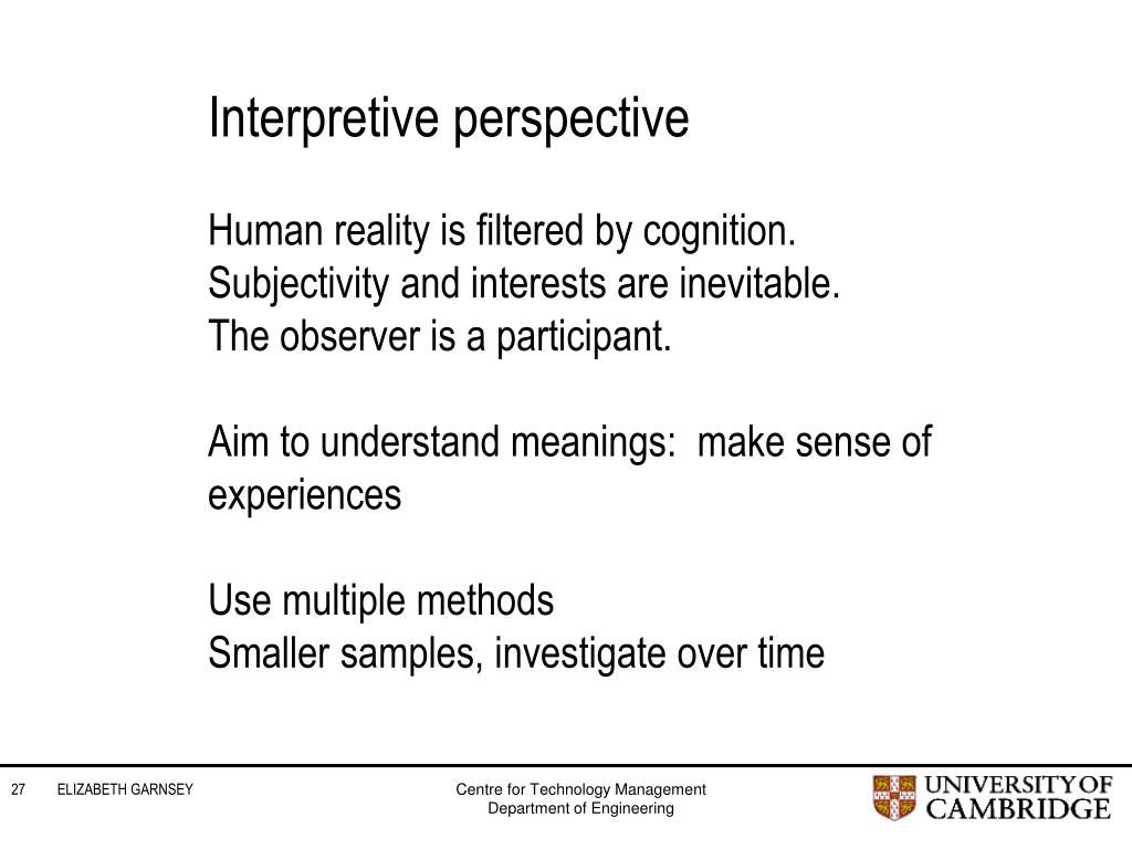Interpretive perspective Human reality is filtered by cognition. Subjectivity and interests are inevitable. The observer is a participant. Aim to understand meanings: make sense of experiences Use multiple methods Smaller samples, investigate over time Centre for Technology Management Department of Engineering