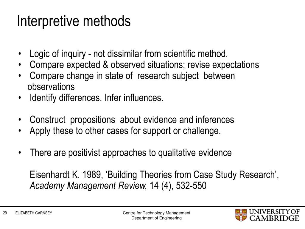 There is overlap between scientific and interpretive approaches in building and testing theory Many scientists now accept: Intrusion of the observer Path dependence (history matters) Limits to prediction Understanding as a goal of science Centre for Technology Management Department of Engineering