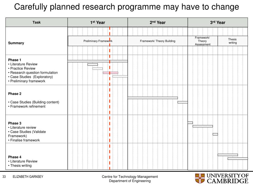Carefully planned research programme may have to change Task 1st Year 2nd Year 3rd Year • Summary • Phase 1 • Literature Review • Practice Review • Research question formulation • Case Studies (Exploratory) • Preliminary framework • Phase 2 • Case Studies (Building content) • Framework refinement • Phase 3 • Literature review • Case Studies (Validate Framework) • Finalise framework • Phase 4 • Literature Review • Thesis writing Preliminary Framework Framework/ Theory Building Framework/ Theory Assessment Thesis writing Centre for Technology Management Department of Engineering