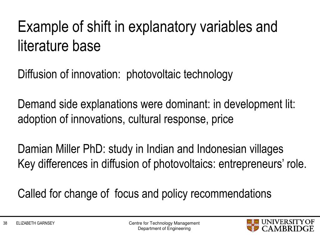 Example of shift in explanatory variables and literature base Diffusion of innovation: photovoltaic technology Demand side explanations were dominant: in development lit: adoption of innovations, cultural response, price Damian Miller PhD: study in Indian and Indonesian villages Key differences in diffusion of photovoltaics: entrepreneurs’ role. Called for change of focus and policy recommendations Centre for Technology Management Department of Engineering