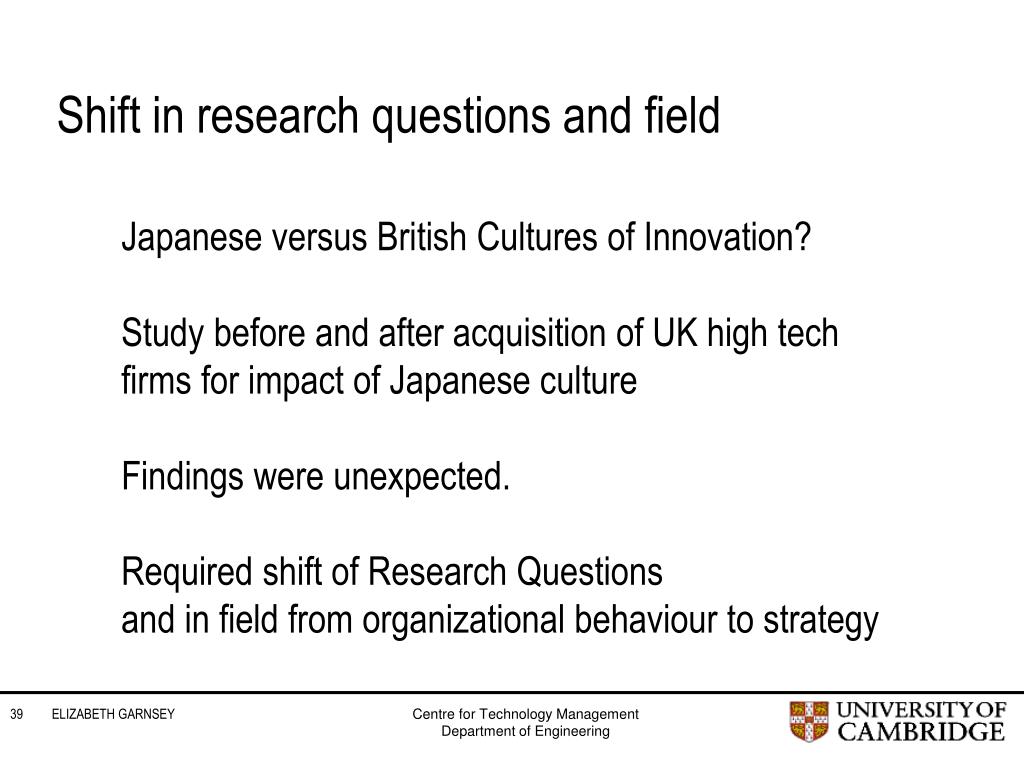 Shift in research questions and field Japanese versus British Cultures of Innovation? Study before and after acquisition of UK high tech firms for impact of Japanese culture Findings were unexpected. Required shift of Research Questions and in field from organizational behaviour to strategy Centre for Technology Management Department of Engineering