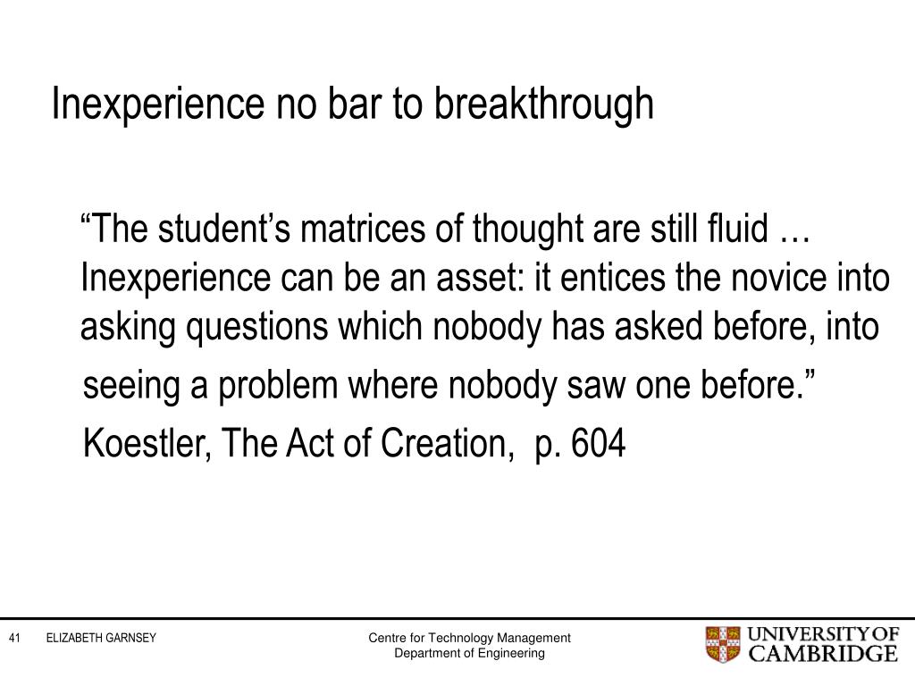 Inexperience no bar to breakthrough “The student’s matrices of thought are still fluid … Inexperience can be an asset: it entices the novice into asking questions which nobody has asked before, into seeing a problem where nobody saw one before.” Koestler, The Act of Creation, p. 604 Centre for Technology Management Department of Engineering
