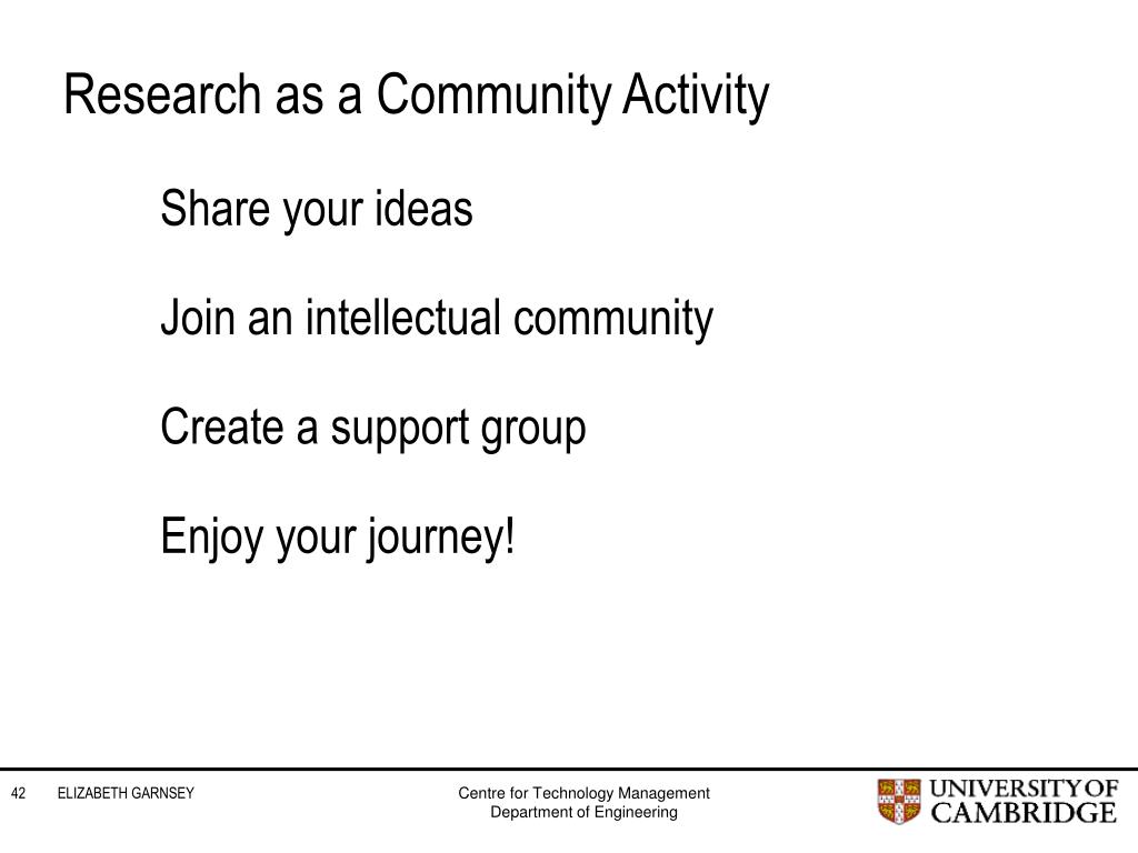 Research as a Community Activity Share your ideas Join an intellectual community Create a support group Enjoy your journey! Centre for Technology Management Department of Engineering