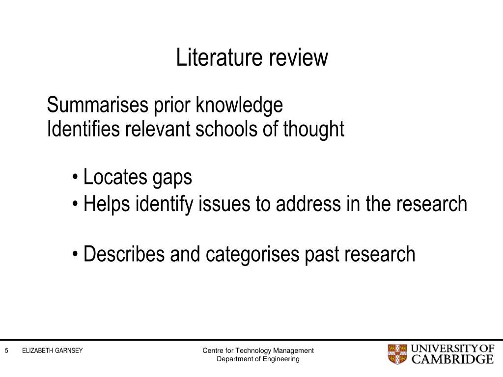 Literature review • Summarises prior knowledge • Identifies relevant schools of thought • Locates gaps • Helps identify issues to address in the research • Describes and categorises past research Centre for Technology Management Department of Engineering