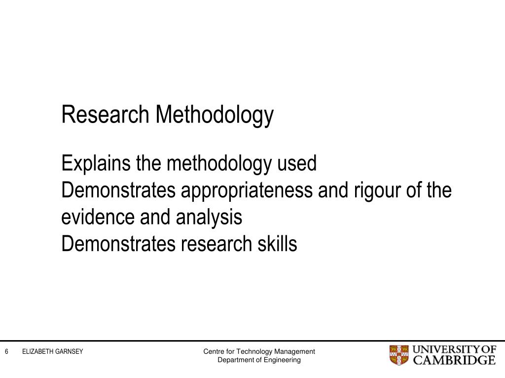 Research Methodology Explains the methodology used Demonstrates appropriateness and rigour of the evidence and analysis Demonstrates research skills Centre for Technology Management Department of Engineering