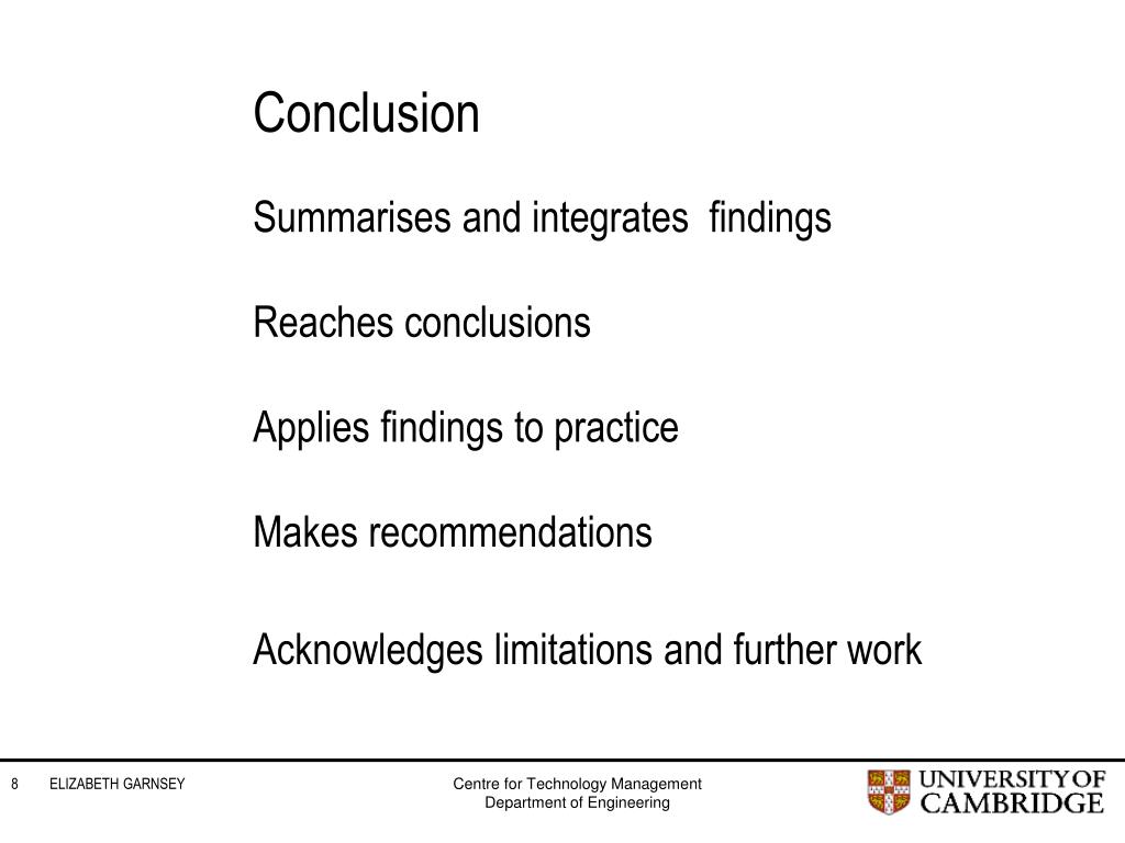 Conclusion Summarises and integrates findings Reaches conclusions Applies findings to practice Makes recommendations Acknowledges limitations and further work Centre for Technology Management Department of Engineering