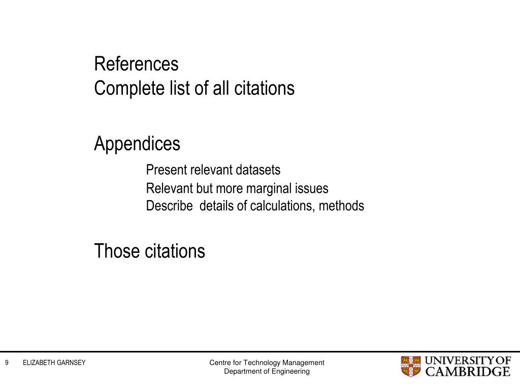 References Complete list of all citations Appendices Present relevant datasets Relevant but more marginal issues Describe details of calculations, methods Those citations Centre for Technology Management Department of Engineering