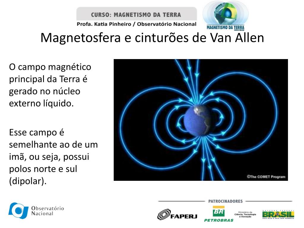 Magnetosfera e cinturões de Van Allen. O campo magnético principal da Terra é gerado no núcleo externo líquido. Esse campo é semelhante ao de um imã, ou seja, possui polos norte e sul (dipolar). Magnetosfera e cinturões de Van Allen.