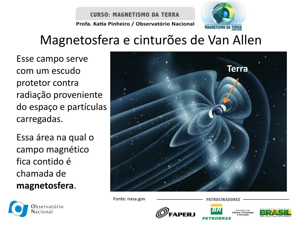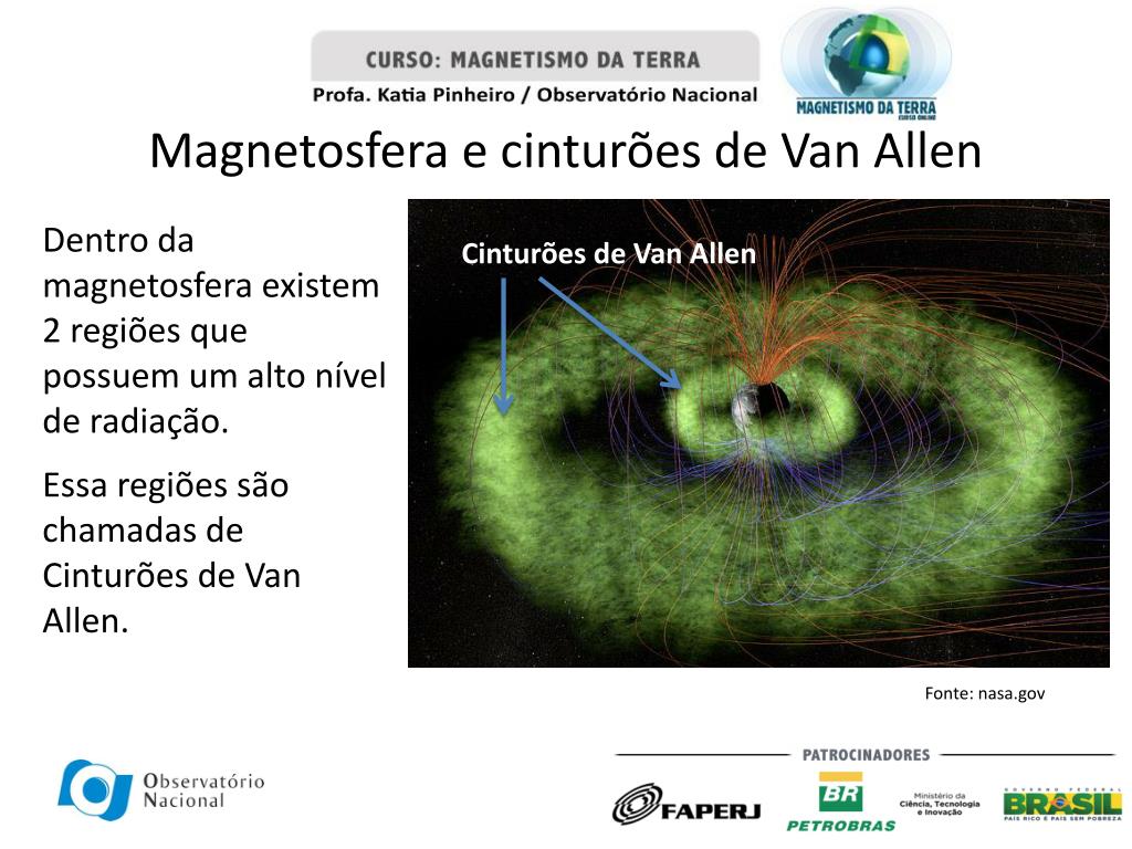 Magnetosfera e cinturões de Van Allen Cinturões de Van Allen Dentro da magnetosfera existem 2 regiões que possuem um alto nível de radiação. Essa regiões são chamadas de Cinturões de Van Allen. Fonte: nasa.gov