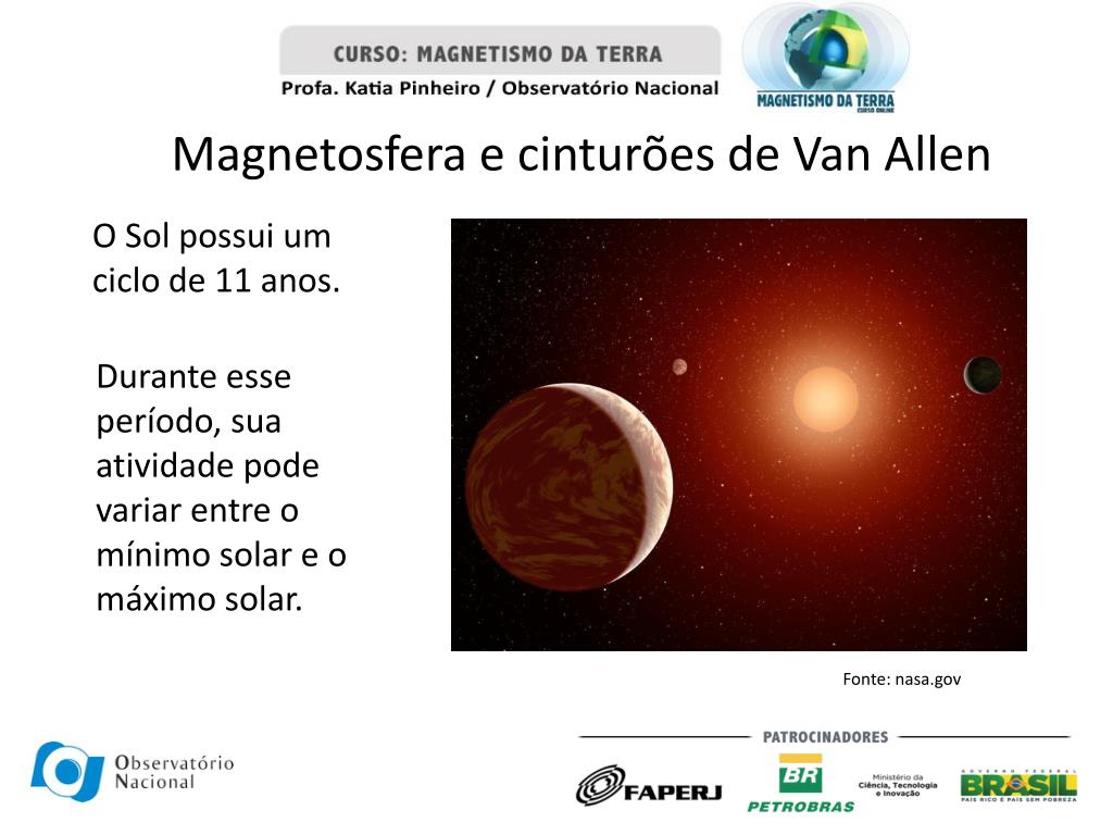 Magnetosfera e cinturões de Van Allen O Sol possui um ciclo de 11 anos. Durante esse período, sua atividade pode variar entre o mínimo solar e o máximo solar. Fonte: nasa.gov