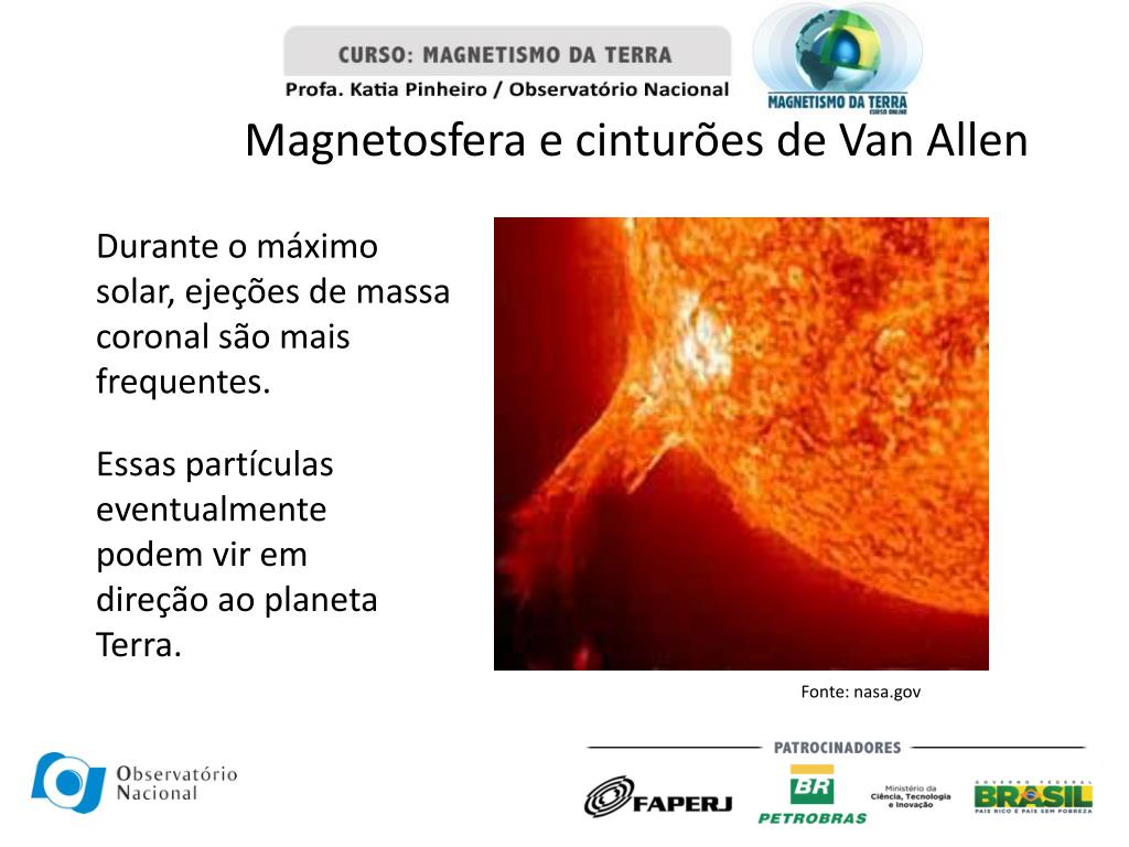 Magnetosfera e cinturões de Van Allen Durante o máximo solar, ejeções de massa coronal são mais frequentes. Essas partículas eventualmente podem vir em direção ao planeta Terra. Fonte: nasa.gov