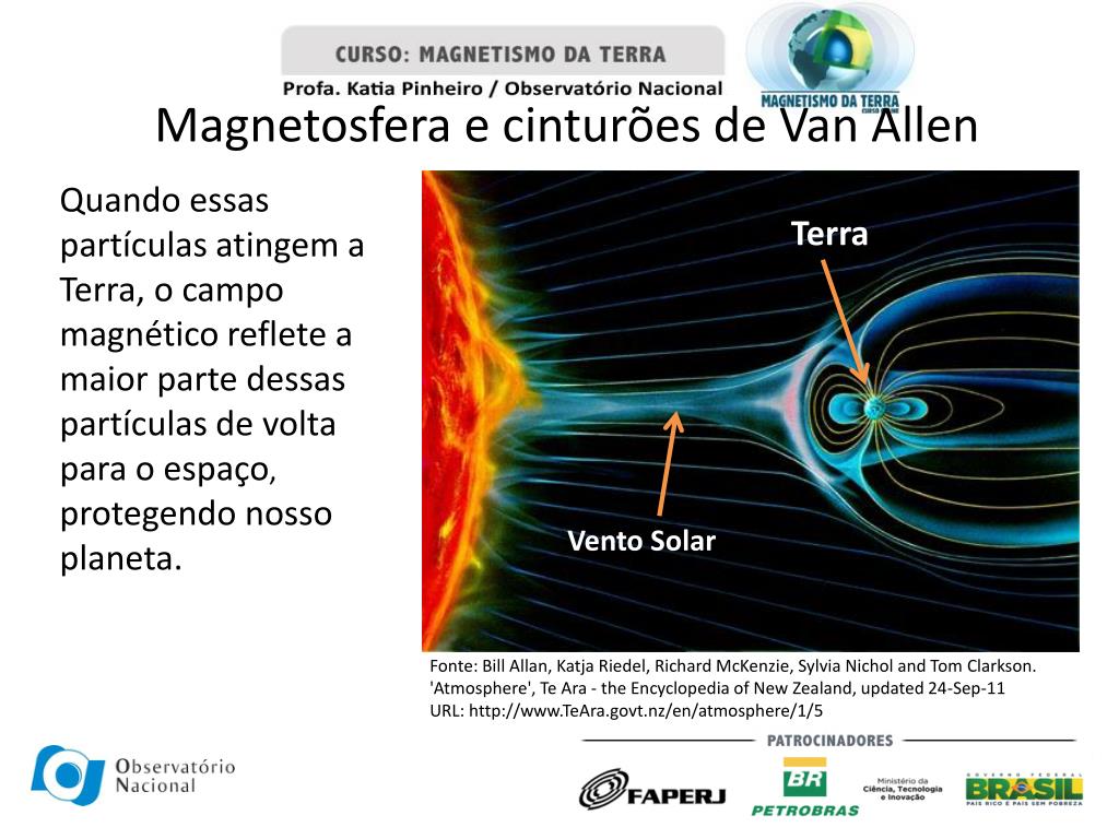 Magnetosfera e cinturões de Van Allen Quando essas partículas atingem a Terra, o campo magnético reflete a maior parte dessas partículas de volta para o espaço, protegendo nosso planeta. Terra Vento Solar Fonte: Bill Allan, Katja Riedel, Richard McKenzie, Sylvia Nichol and Tom Clarkson. 'Atmosphere', Te Ara - the Encyclopedia of New Zealand, updated 24-Sep-11 URL: http://www.TeAra.govt.nz/en/atmosphere/1/5