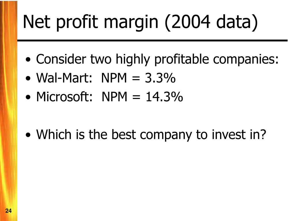 Net profit margin (2004 data) • Consider two highly profitable companies: • Wal-Mart: NPM = 3.3% • Microsoft: NPM = 14.3% • Which is the best company to invest in?