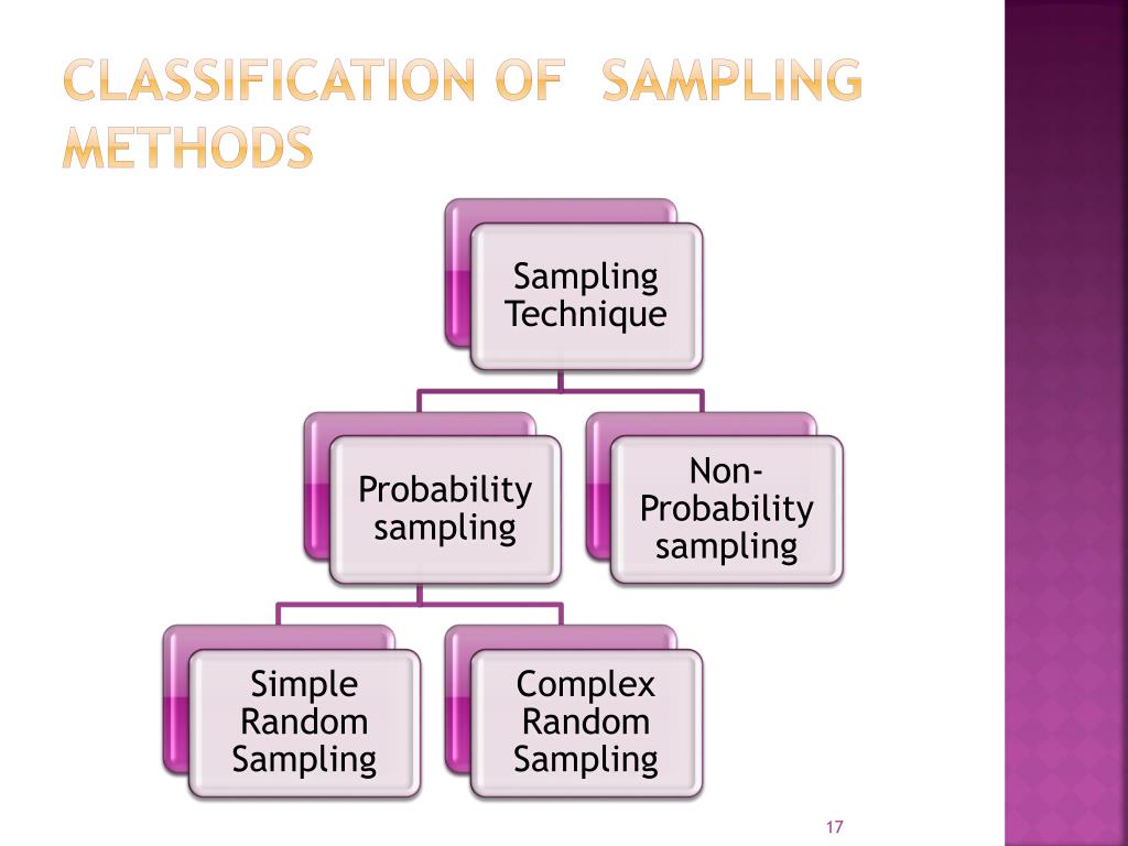 Complex random sampling • Also known as mixed sampling design. • Under restricted sampling techniques, the probability sampling may result in complex random sampling designs. • such designs may represent a combination of probability and non-probability sampling procedures in selecting a sample.