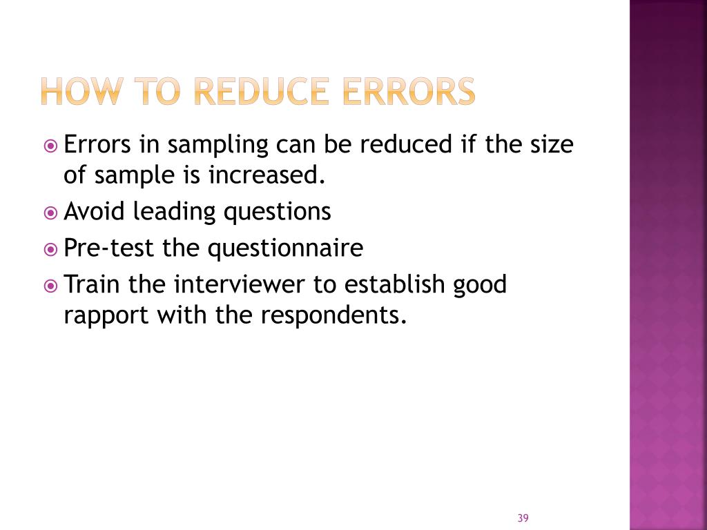 How to reduce errors • Errors in sampling can be reduced if the size of sample is increased. • Avoid leading questions • Pre-test the questionnaire • Train the interviewer to establish good rapport with the respondents.