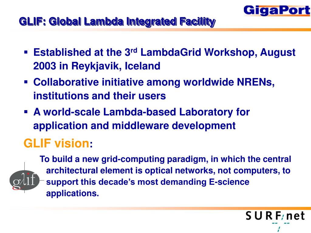 GLIF: Global Lambda Integrated Facility • Established at the 3rd LambdaGrid Workshop, August 2003 in Reykjavik, Iceland • Collaborative initiative among worldwide NRENs, institutions and their users • A world-scale Lambda-based Laboratory for application and middleware development GLIF vision: To build a new grid-computing paradigm, in which the central architectural element is optical networks, not computers, to support this decade’s most demanding E-science applications.