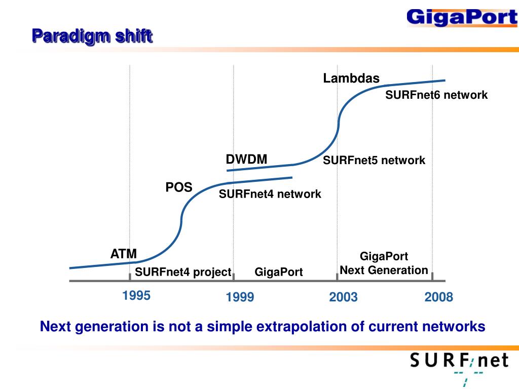 Paradigm shift Lambdas SURFnet6 network DWDM SURFnet5 network POS SURFnet4 network ATM GigaPort Next Generation SURFnet4 project GigaPort 1995 1999 2003 2008 Next generation is not a simple extrapolation of current networks