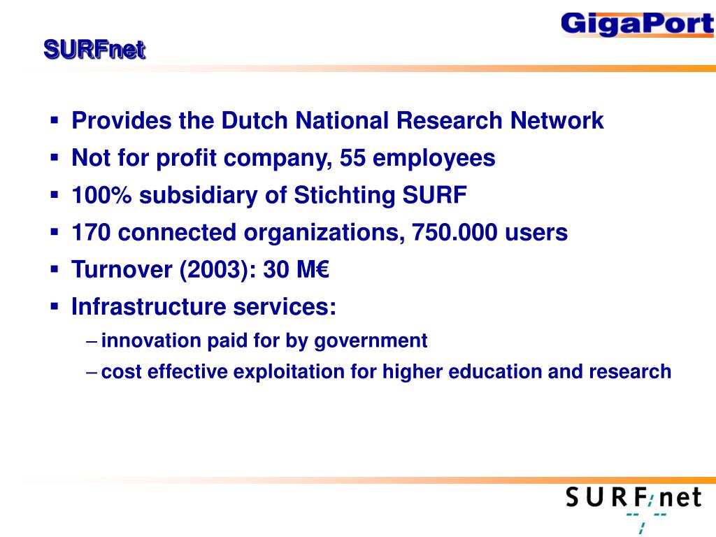 SURFnet • Provides the Dutch National Research Network • Not for profit company, 55 employees • 100% subsidiary of Stichting SURF • 170 connected organizations, 750.000 users • Turnover (2003): 30 M€ • Infrastructure services: • innovation paid for by government • cost effective exploitation for higher education and research