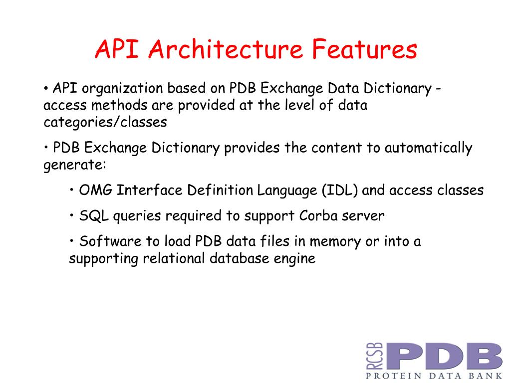 API Architecture Features • API organization based on PDB Exchange Data Dictionary - access methods are provided at the level of data categories/classes • PDB Exchange Dictionary provides the content to automatically generate: • OMG Interface Definition Language (IDL) and access classes • SQL queries required to support Corba server • Software to load PDB data files in memory or into a supporting relational database engine