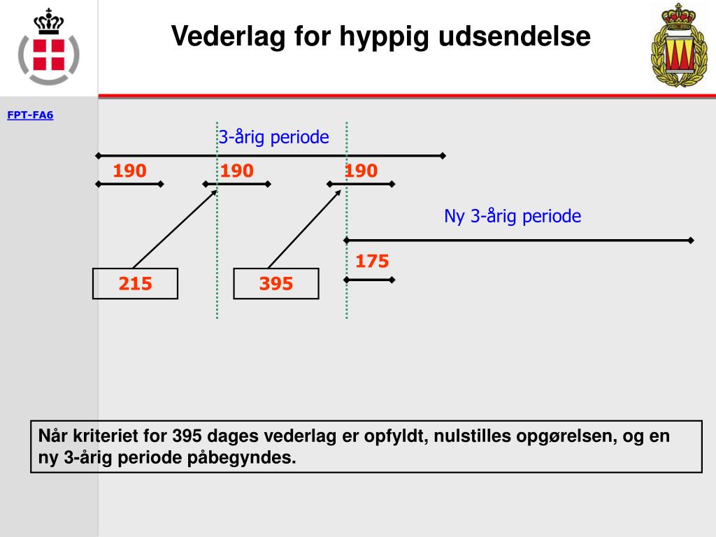 Vederlag for hyppig udsendelse 3-årig periode 190 190 190 Ny 3-årig periode 175 215 395 Når kriteriet for 395 dages vederlag er opfyldt, nulstilles opgørelsen, og en ny 3-årig periode påbegyndes.