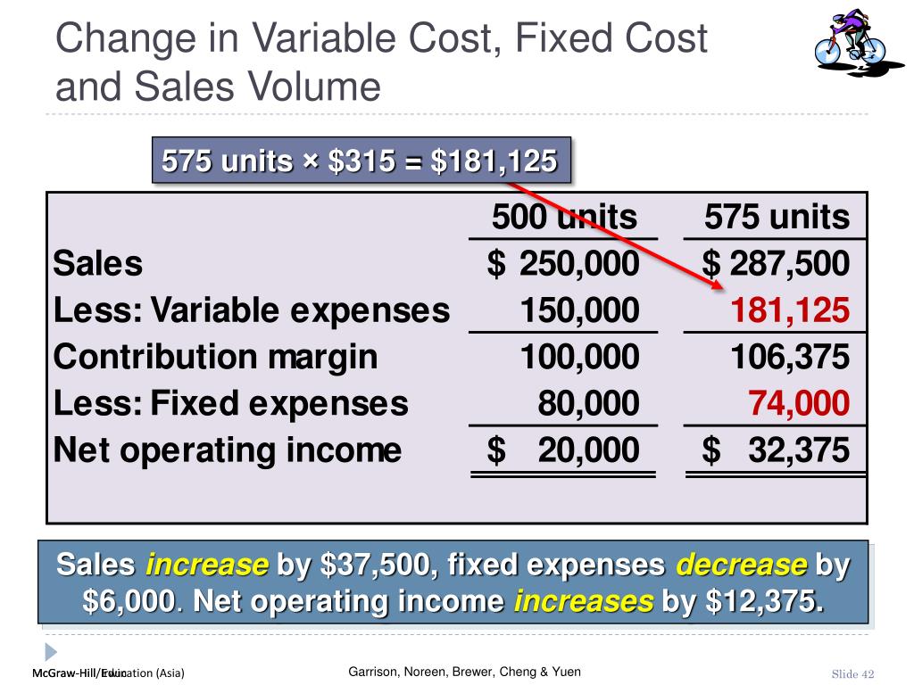 575 units × $315 = $181,125 Change in Variable Cost, Fixed Costand Sales Volume Sales increase by $37,500, fixed expenses decrease by $6,000. Net operating income increases by $12,375.