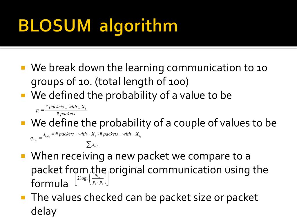 BLOSUM algorithm • We break down the learning communication to 10 groups of 10. (total length of 100) • We defined the probability of a value to be • We define the probability of a couple of values to be • When receiving a new packet we compare to a packet from the original communication using the formula • The values checked can be packet size or packet delay