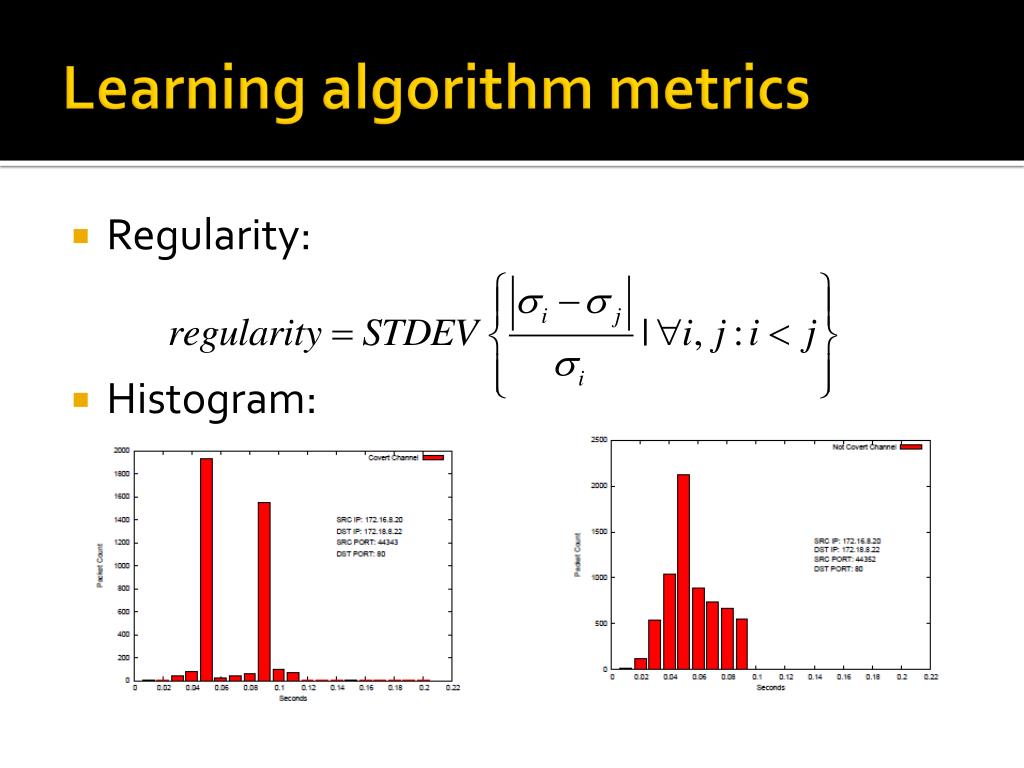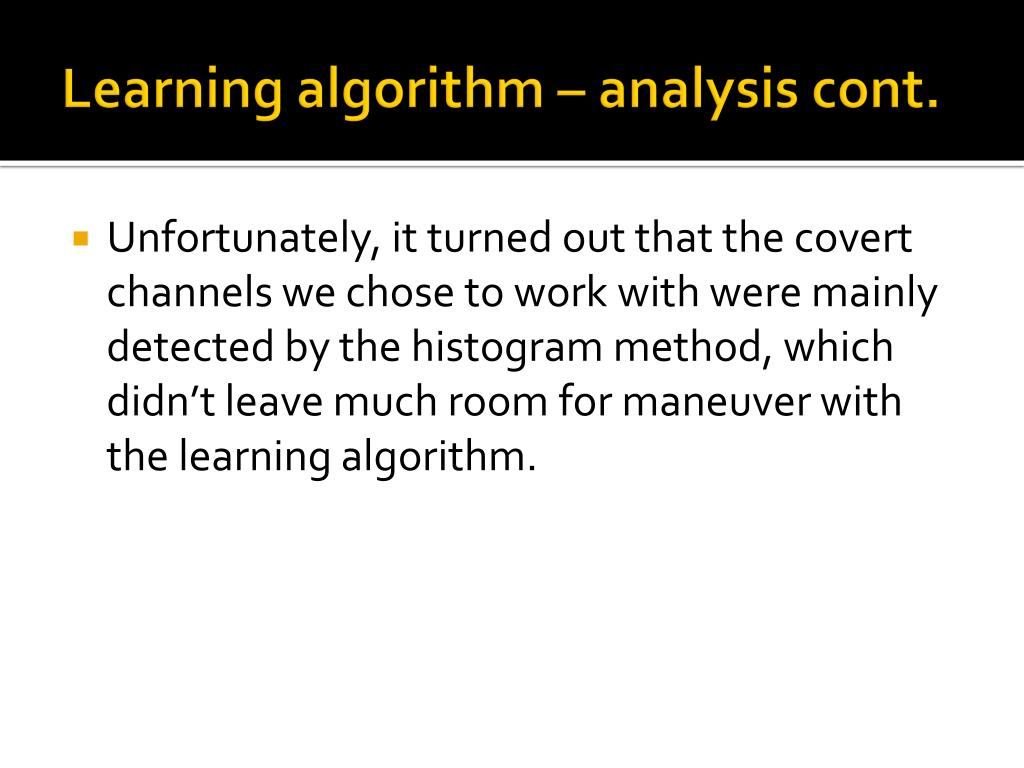 Learning algorithm – analysis cont. • Unfortunately, it turned out that the covert channels we chose to work with were mainly detected by the histogram method, which didn’t leave much room for maneuver with the learning algorithm.