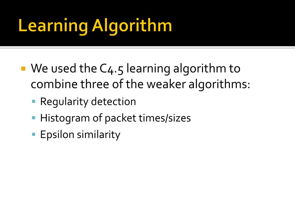 Learning Algorithm • We used the C4.5 learning algorithm to combine three of the weaker algorithms: • Regularity detection • Histogram of packet times/sizes • Epsilon similarity