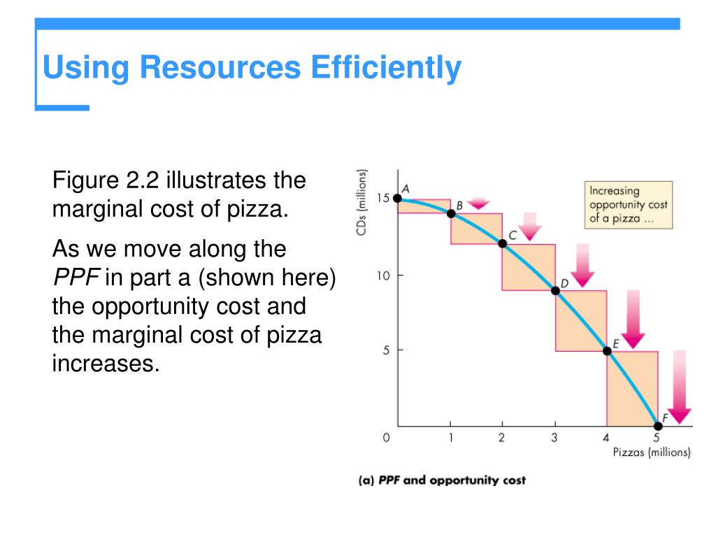 Using Resources Efficiently • Figure 2.2 illustrates the marginal cost of pizza. • As we move along the PPF in part a (shown here) the opportunity cost and the marginal cost of pizza increases.