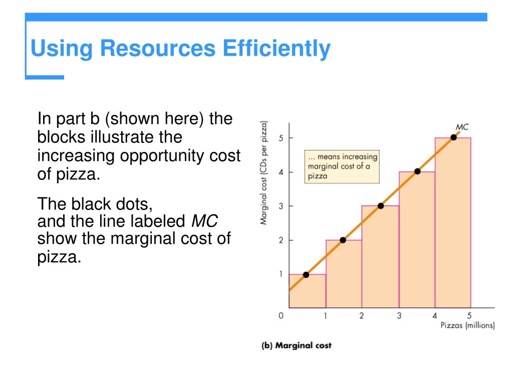 Using Resources Efficiently • In part b (shown here) the blocks illustrate the increasing opportunity cost of pizza. • The black dots, • and the line labeled MC • show the marginal cost of pizza.
