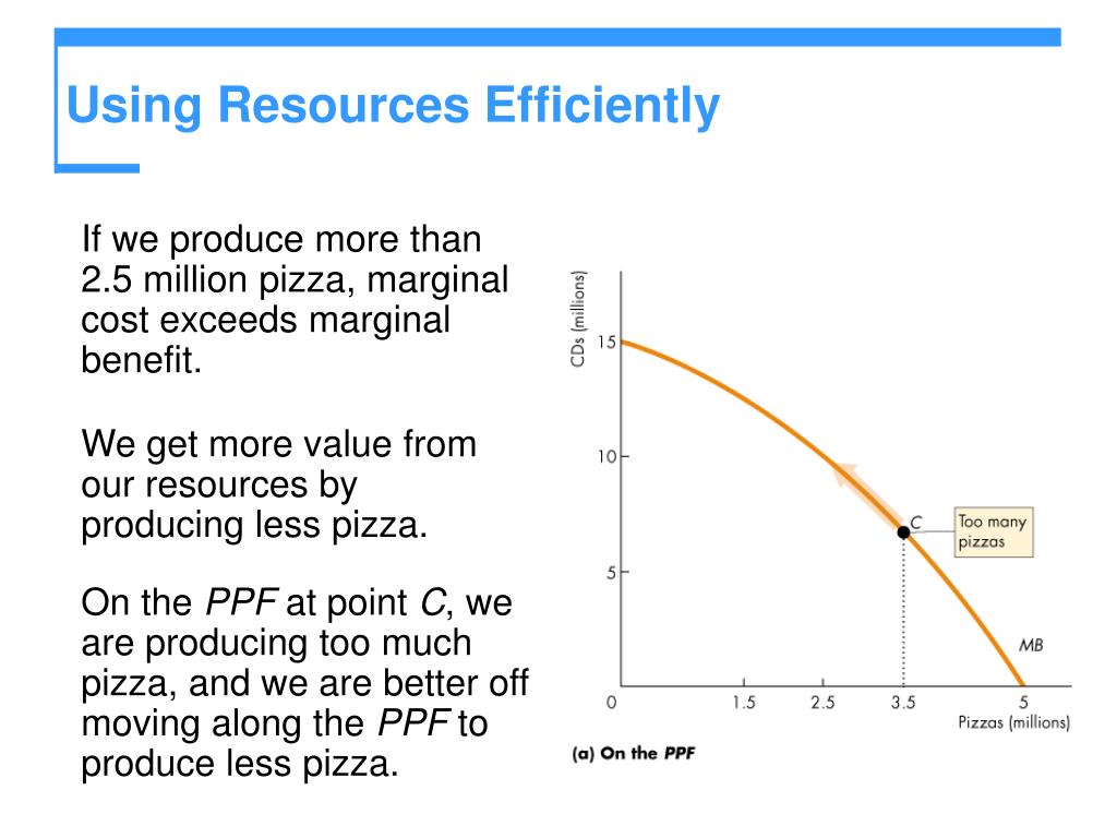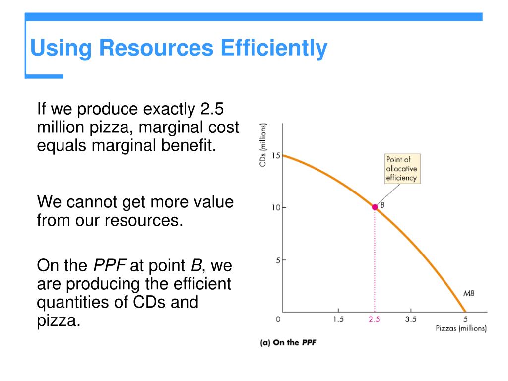Using Resources Efficiently • If we produce exactly 2.5 million pizza, marginal cost equals marginal benefit. • We cannot get more value from our resources. • On the PPF at point B, we are producing the efficient quantities of CDs and pizza.