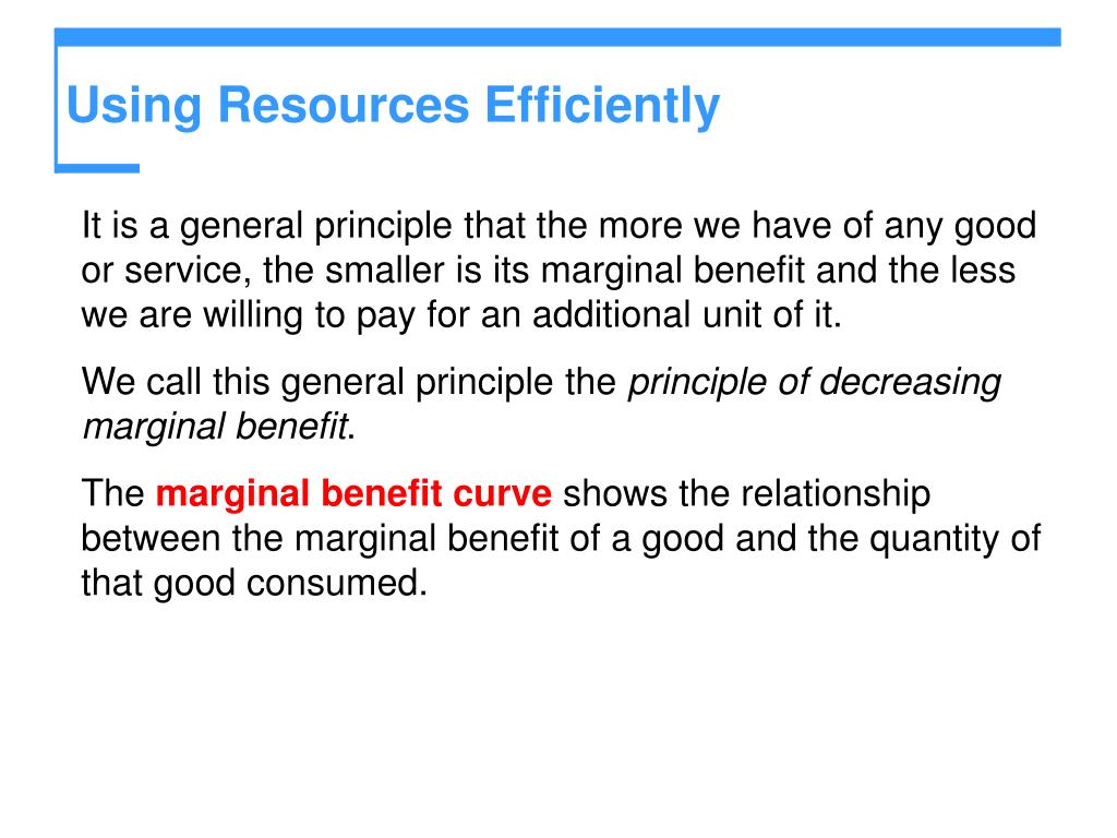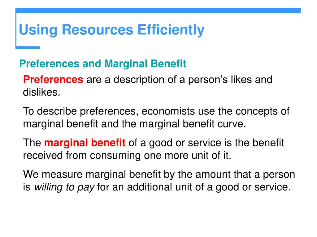 Using Resources Efficiently • Preferences and Marginal Benefit • Preferences are a description of a person’s likes and dislikes. • To describe preferences, economists use the concepts of marginal benefit and the marginal benefit curve. • The marginal benefit of a good or service is the benefit received from consuming one more unit of it. • We measure marginal benefit by the amount that a person is willing to pay for an additional unit of a good or service.