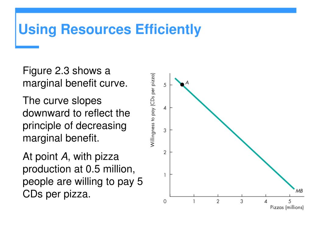 Using Resources Efficiently • Figure 2.3 shows a marginal benefit curve. • The curve slopes downward to reflect the principle of decreasing marginal benefit. • At point A, with pizza production at 0.5 million, people are willing to pay 5 CDs per pizza.