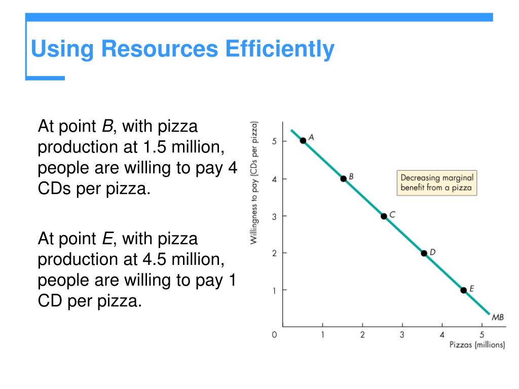 Using Resources Efficiently • At point B, with pizza production at 1.5 million, people are willing to pay 4 CDs per pizza. • At point E, with pizza production at 4.5 million, people are willing to pay 1 CD per pizza.