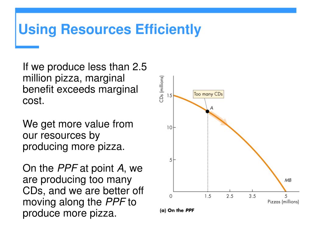 Using Resources Efficiently • If we produce less than 2.5 million pizza, marginal benefit exceeds marginal cost. • We get more value from our resources by producing more pizza. • On the PPF at point A, we are producing too many CDs, and we are better off moving along the PPF to produce more pizza.