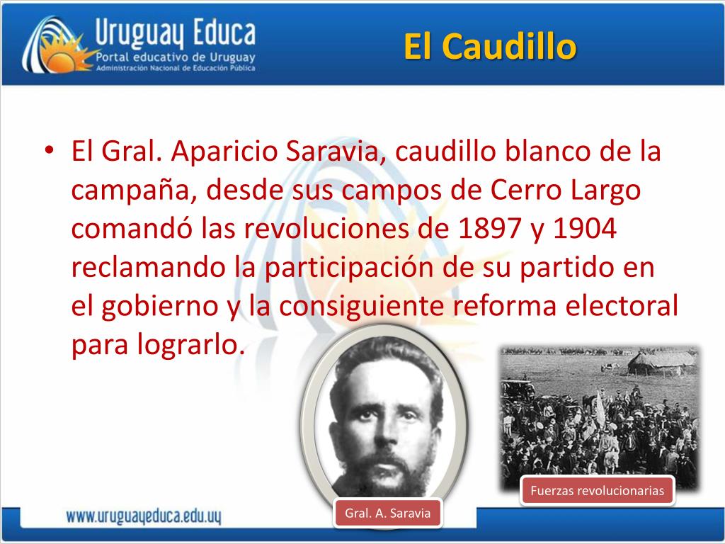 El Caudillo • El Gral. Aparicio Saravia, caudillo blanco de la campaña, desde sus campos de Cerro Largo comandó las revoluciones de 1897 y 1904 reclamando la participación de su partido en el gobierno y la consiguiente reforma electoral para lograrlo. Fuerzas revolucionarias Gral. A. Saravia
