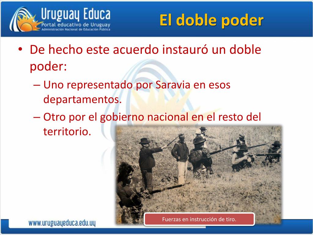 El doble poder • De hecho este acuerdo instauró un doble poder: • Uno representado por Saravia en esos departamentos. • Otro por el gobierno nacional en el resto del territorio. Fuerzas en instrucción de tiro.