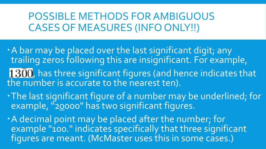 Possible methods for ambiguous cases of measures (info only!!) • A bar may be placed over the last significant digit; any trailing zeros following this are insignificant. For example, , has three significant figures (and hence indicates that the number is accurate to the nearest ten). • The last significant figure of a number may be underlined; for example, "20000" has two significant figures. • A decimal point may be placed after the number; for example "100." indicates specifically that three significant figures are meant. (McMaster uses this in some cases.)