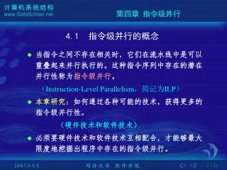 第四章 指令级并行 4.1 指令级并行的概念 • 当指令之间不存在相关时,它们在流水线中是可以重叠起来并行执行的。这种指令序列中存在的潜在并行性称为指令级并行。 (Instruction-Level Parallelism,简记为ILP) • 本章研究:如何通过各种可能的技术,获得更多的指令级并行性。 (硬件技术和软件技术) • 必须要硬件技术和软件技术互相配合,才能够最大限度地挖掘出程序中存在的指令级并行。