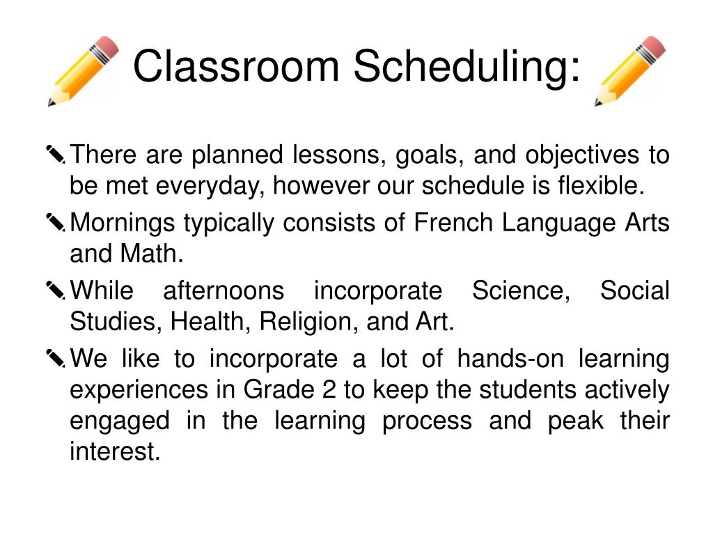 Classroom Scheduling: • There are planned lessons, goals, and objectives to be met everyday, however our schedule is flexible. • Mornings typically consists of French Language Arts and Math. • While afternoons incorporate Science, Social Studies, Health, Religion, and Art. • We like to incorporate a lot of hands-on learning experiences in Grade 2 to keep the students actively engaged in the learning process and peak their interest.