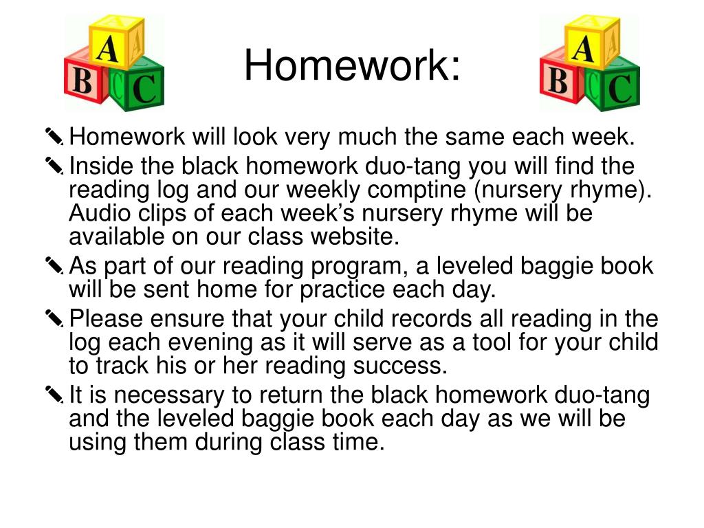 Homework: • Homework will look very much the same each week. • Inside the black homework duo-tang you will find the reading log and our weekly comptine (nursery rhyme). Audio clips of each week’s nursery rhyme will be available on our class website. • As part of our reading program, a leveled baggie book will be sent home for practice each day. • Please ensure that your child records all reading in the log each evening as it will serve as a tool for your child to track his or her reading success. • It is necessary to return the black homework duo-tang and the leveled baggie book each day as we will be using them during class time.