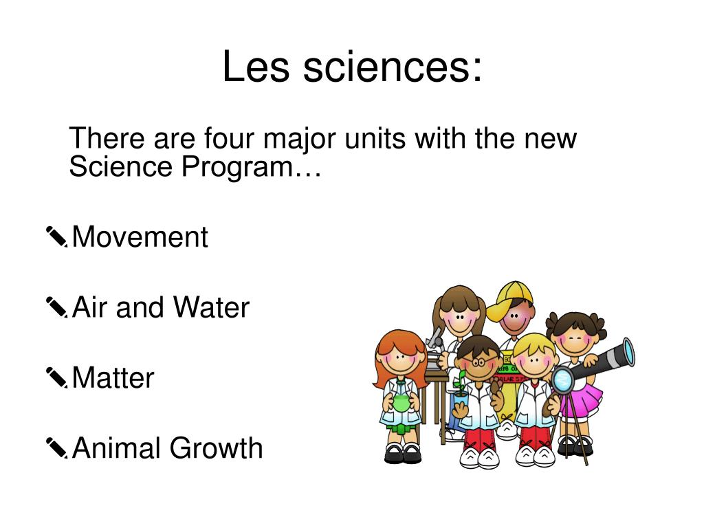 Les sciences: There are four major units with the new Science Program… • Movement • Air and Water • Matter • Animal Growth