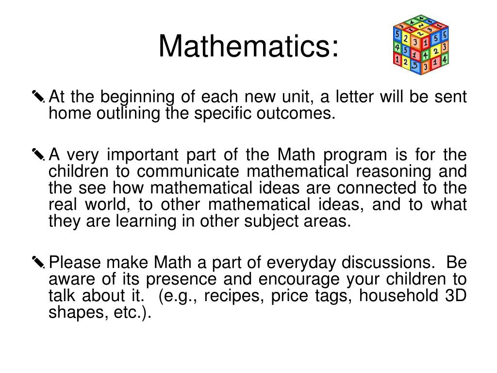 Mathematics: • At the beginning of each new unit, a letter will be sent home outlining the specific outcomes. • A very important part of the Math program is for the children to communicate mathematical reasoning and the see how mathematical ideas are connected to the real world, to other mathematical ideas, and to what they are learning in other subject areas. • Please make Math a part of everyday discussions. Be aware of its presence and encourage your children to talk about it. (e.g., recipes, price tags, household 3D shapes, etc.).