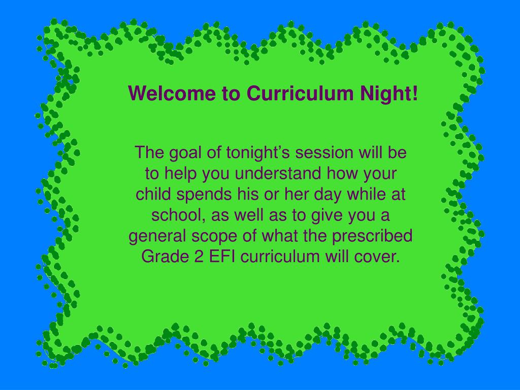 Welcome to Curriculum Night! The goal of tonight’s session will be to help you understand how your child spends his or her day while at school, as well as to give you a general scope of what the prescribed Grade 2 EFI curriculum will cover.