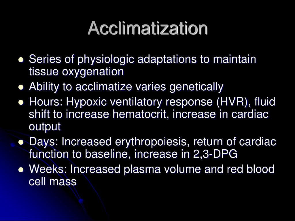 Acclimatization • Series of physiologic adaptations to maintain tissue oxygenation • Ability to acclimatize varies genetically • Hours: Hypoxic ventilatory response (HVR), fluid shift to increase hematocrit, increase in cardiac output • Days: Increased erythropoiesis, return of cardiac function to baseline, increase in 2,3-DPG • Weeks: Increased plasma volume and red blood cell mass