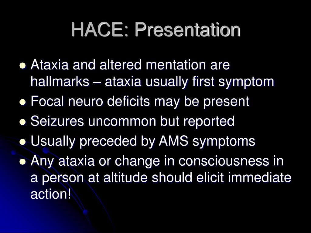HACE: Presentation • Ataxia and altered mentation are hallmarks – ataxia usually first symptom • Focal neuro deficits may be present • Seizures uncommon but reported • Usually preceded by AMS symptoms • Any ataxia or change in consciousness in a person at altitude should elicit immediate action!