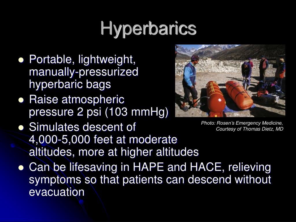 Hyperbarics • Portable, lightweight,manually-pressurizedhyperbaric bags • Raise atmospheric pressure 2 psi (103 mmHg) • Simulates descent of 4,000-5,000 feet at moderate altitudes, more at higher altitudes • Can be lifesaving in HAPE and HACE, relieving symptoms so that patients can descend without evacuation Photo: Rosen’s Emergency Medicine, Courtesy of Thomas Dietz, MD
